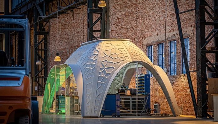 在建筑領域,Royal3D打印服務已經生產了一種可以作為3D打印工作空間的庇護所。PET是制造水瓶和食物容器的臭名昭著的塑料,被用來建造它。這個展館被稱為R-IGLO,是在制造商CEAD的CFAM Prime機器上設計的。由于設計和工程工作,R-IGLO配備了通風,供暖,電力和LED照明。它的一個優點是他們可以制造出你想要的任何尺寸和顏色,而且它的制造時間只有幾個星期。這是一個適應客戶需求和不同位置的選項,因此它既可以在您的工作場所使用,也可以用作展臺!
